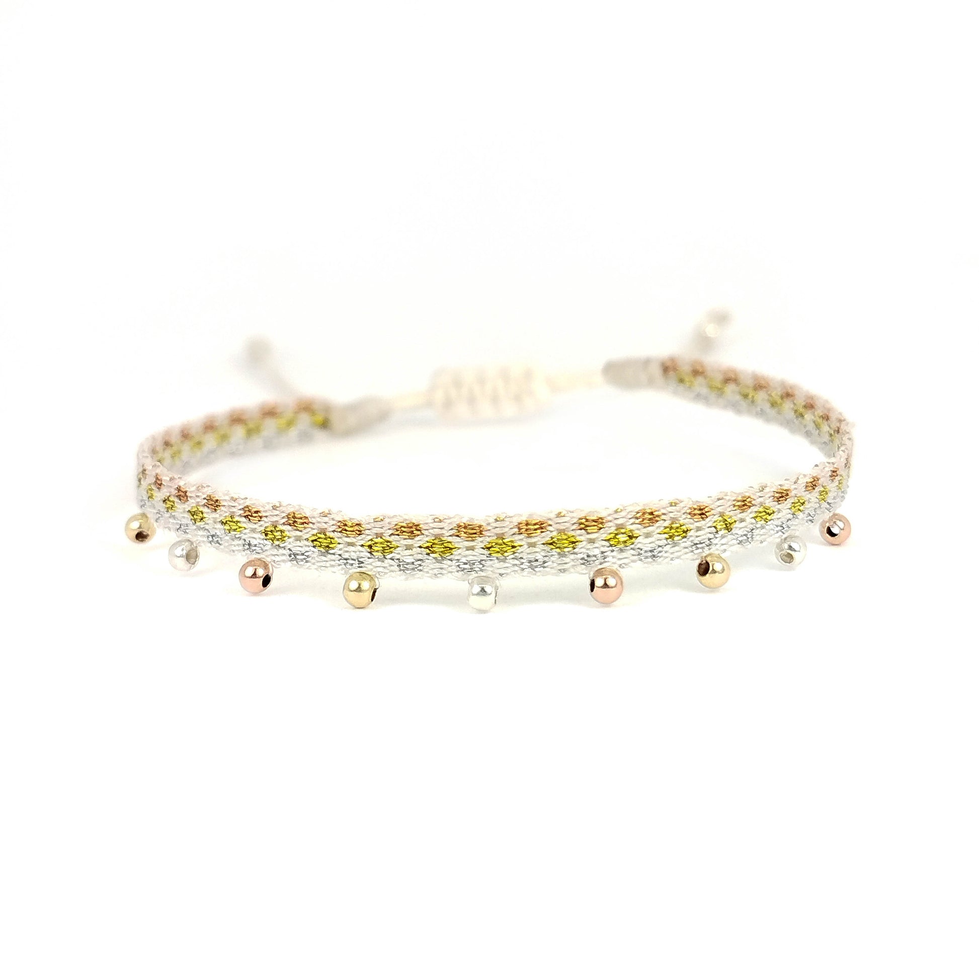Pulsera elaborada en telar egipcio con 40 hilos de bordar y balines de oro, plata y oro rosado.
