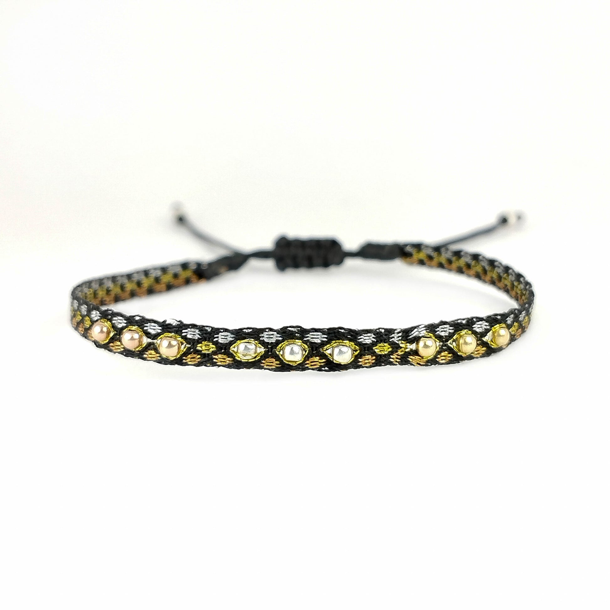 Pulsera elaborada en telar egipcio con 40 hilos de bordar y balines de oro, plata y oro rosado.